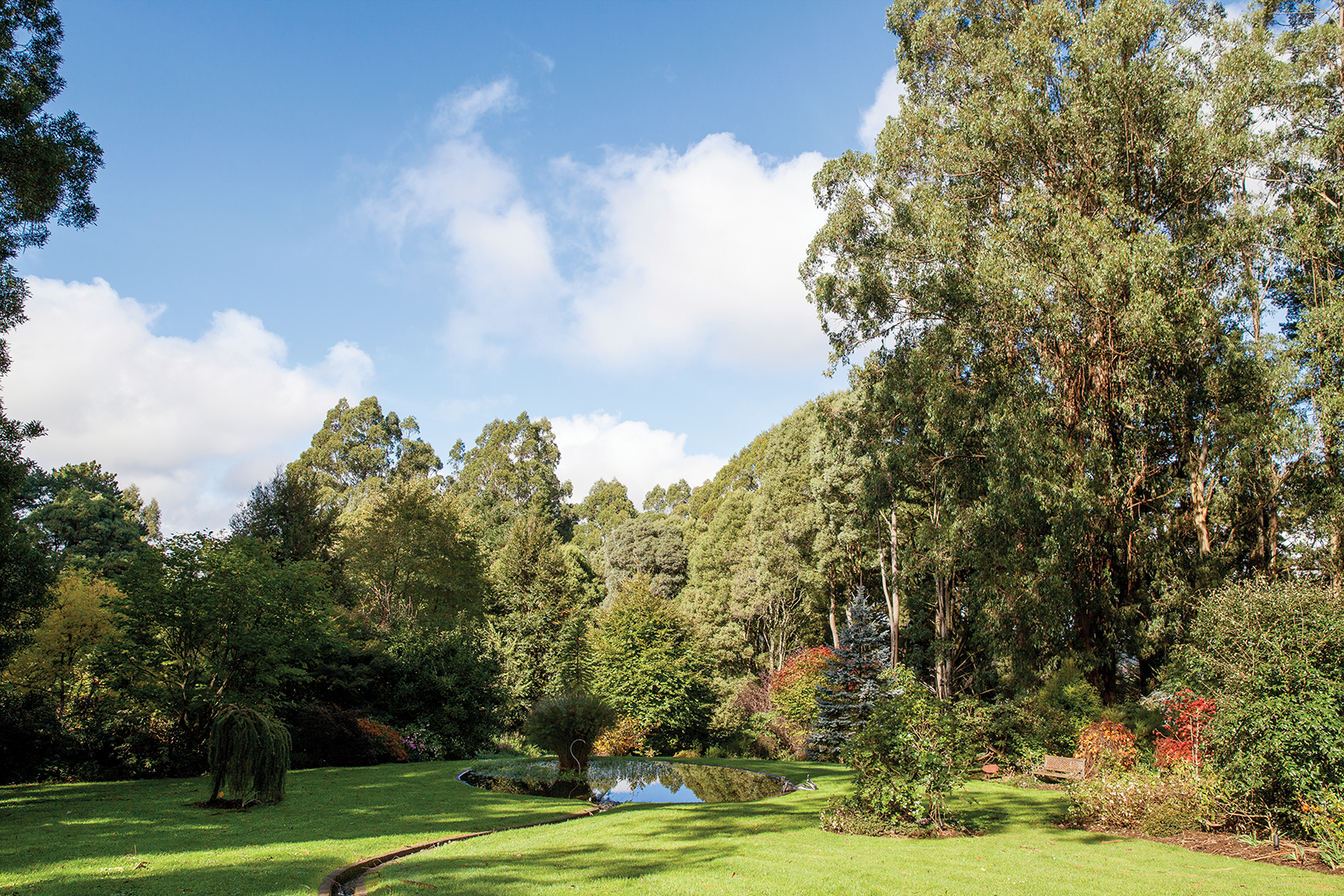 It’s easy to see why Cherrie fell in love with the property- its breath taking beauty is evident at every twist and turn of the garden. Winding your way along hedged paths framed by towering Mountain Ash, Blackwood Wattles and mature native Myrtle Beeches the garden has an impressive collection of rhododendrons, camellias and magnolias. Not to be missed is the serpentine rill (pebble water run) rippling through a vast expanse of green lawn to a reflective dew pond. There is a croquet lawn, a native garden and a former tennis court, now a walled garden with a central pond, and plantings of wisterias, clematis, and seasonal Japanese windflowers. One of the most whimsical features of Beechmont is the ‘Alice in Wonderland’ inspired card parterre garden featuring hedged flower beds in the shape of card suits. Hearts, clubs, diamonds and spades frame a central garden bed and terracotta urn. The ‘Persimmons Avenue’ is a wonderful sensory experience and includes a number of scented plants and a collection of fragrant daphnes.