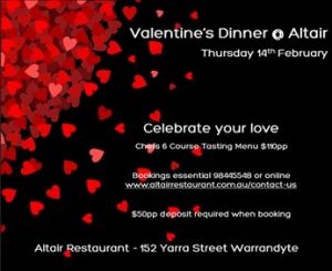 $110Celebrate Valentine’s Day at Altair on Thursday 14 February 2019 with a chefs 6 course tasting menu!