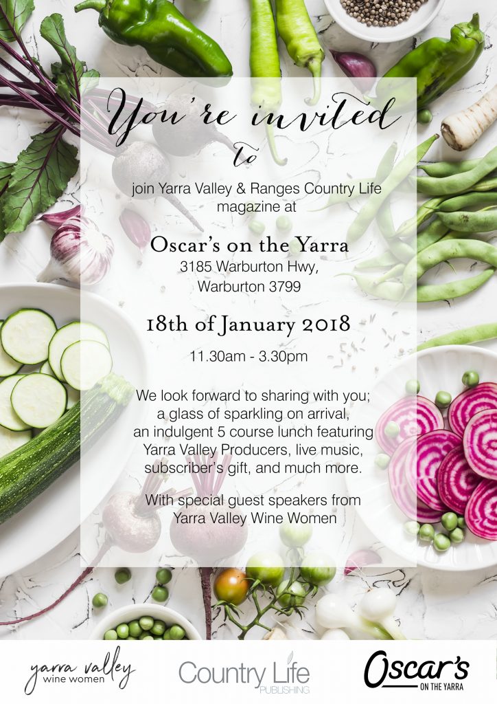 You're invited to join us to celebrate another year of Yarra Valley & Ranges Magazine at Oscar's on the Yarra 3185 Warburton Hwy, Warburton 3799 18th of January 2018 11.30am - 3.30pm Enjoy a glass of sparkling wine on arrival, an indulgent 5 course lunch featuring the bountiful produce of the Yarra Valley, live music, subscriber's gift, and much more. With special guest speakers from Yarra Valley Wine Women. Purchase your ticket here.